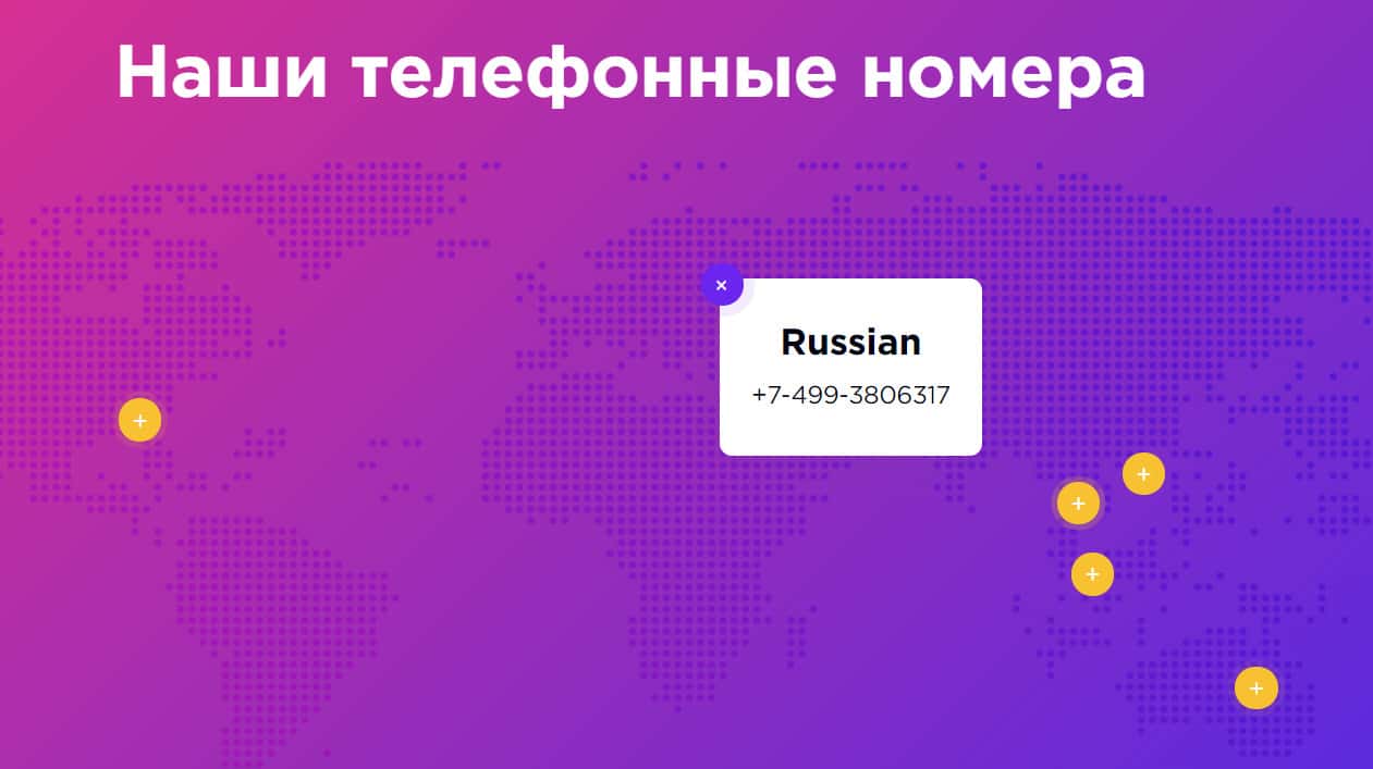 Брокер IQCent выложил на своем сайте множество телефонных номеров из разных стран, якобы принадлежащих ему. Скорее всего, большинство из них фейковые, кроме московского.