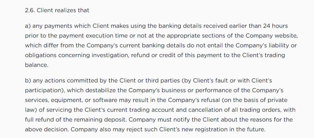 Далее, в пункте 2.6. говорится, что, если клиент дестабилизирует деятельность компании, то она может отказать в обслуживании его счета и блокирует его учетную запись.