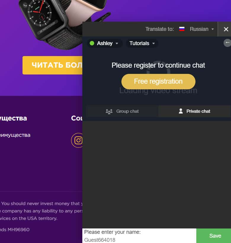Также внизу страницы можно заметить окно чата с техподдержкой. Трудно сказать, работает оно или нет, но данные о клиенте пытаются собрать и там.