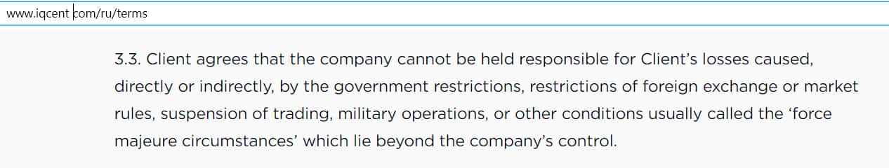 В пункте 3.3 организаторы лохотрона АйКью Цент с пишут о том, что клиент соглашается с тем, что компания не несет ответственности за все его убытки.