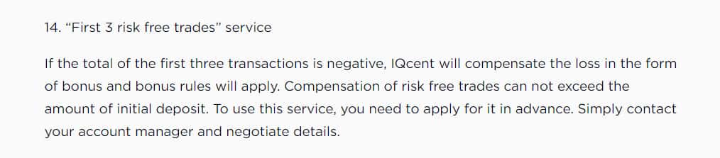 В пункте 14 договора компания АйКью Цент говорит о том, что дает бонусы за первые три сделки, если они окажутся убыточными.