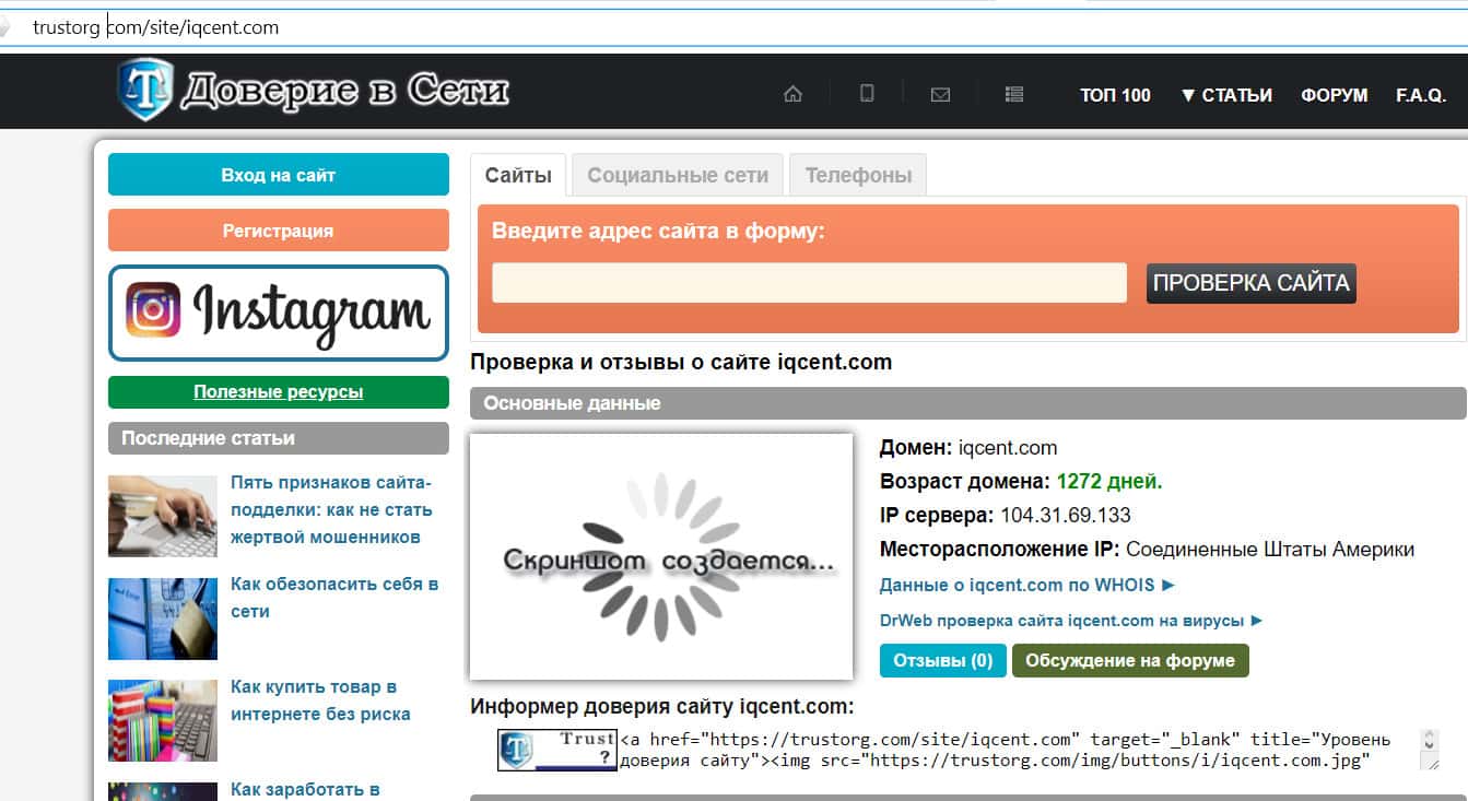 Возраст доменного имени сайта IQCent составляет 1272 дня. Так как контора новая, это означает, что мошенники купили домен у какой-то старой компании.
