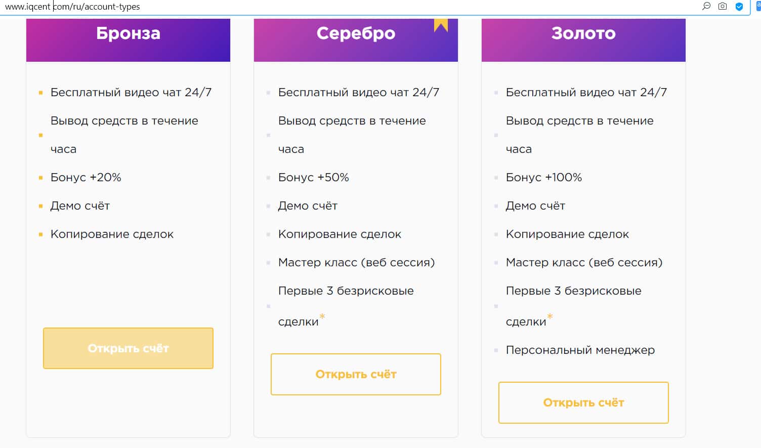 Если посмотреть на типы счетов, указанные на сайте брокерской компании АйКью Цент, то сразу понятно, что они фальшивые, на них даже не написаны минимальные депозиты.