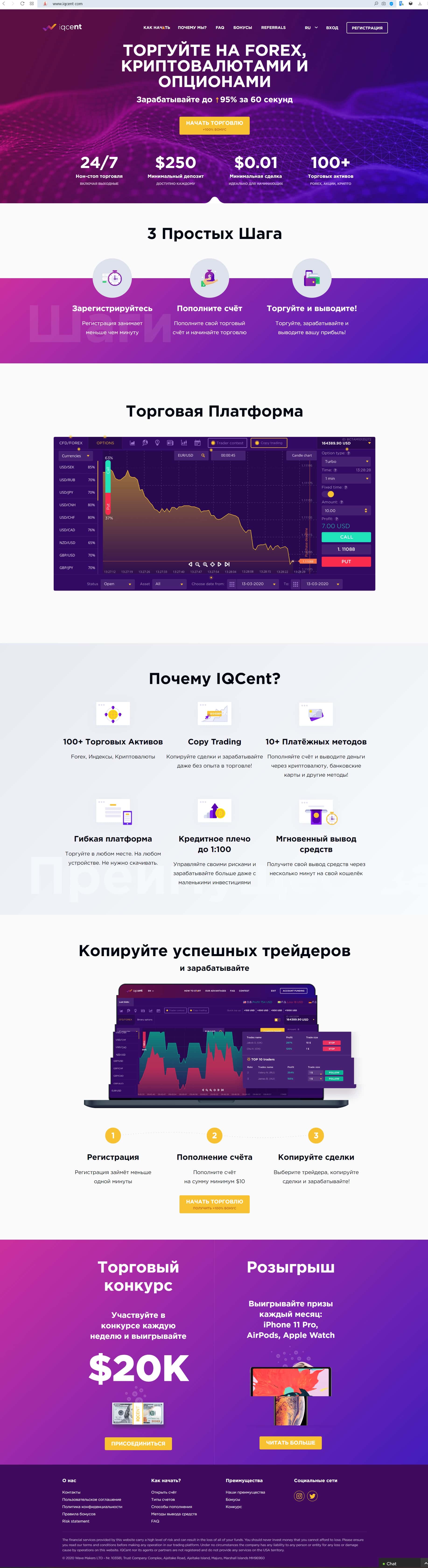 Сайт брокера АйКью Цент представляет собой абсолютно шаблонный ресурс, скопированный с других лохотронов. Он неинформативен и примитивен до ужаса.