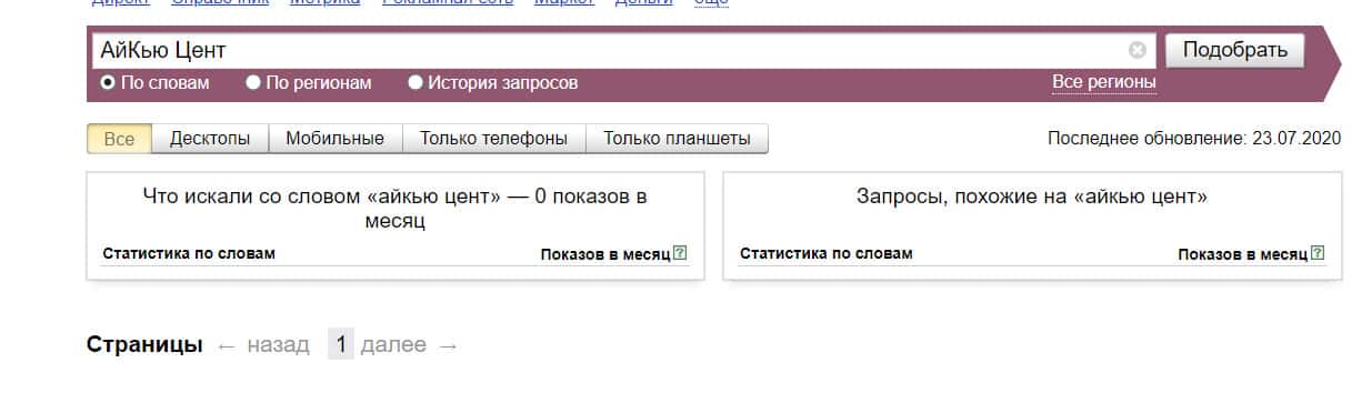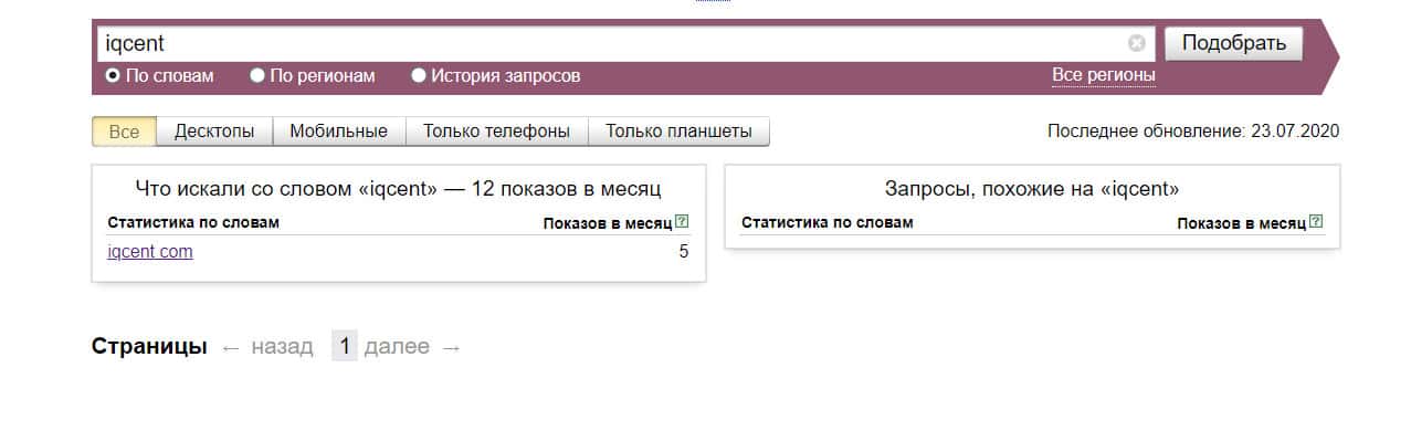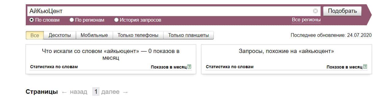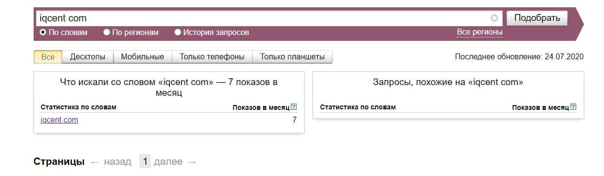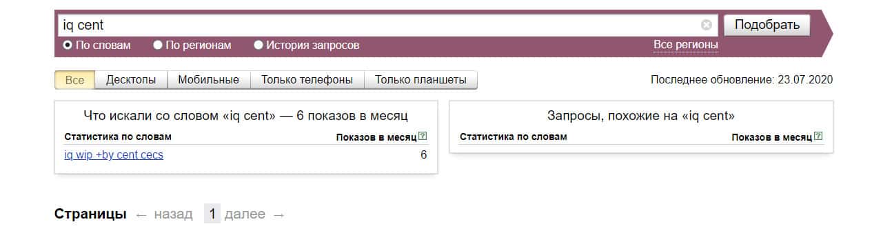 Проверка по названию бренда на английском языке с пробелом "iq cent" дала следующий результат: 6 показов - компанию искали крайне редко.