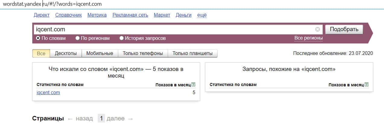 Количество запросов по домену "iqcent.com" с точкой, совершенных пользователями в сервисе Яндекс, равняется 5 показам. Брокер спросом явно не пользуется.