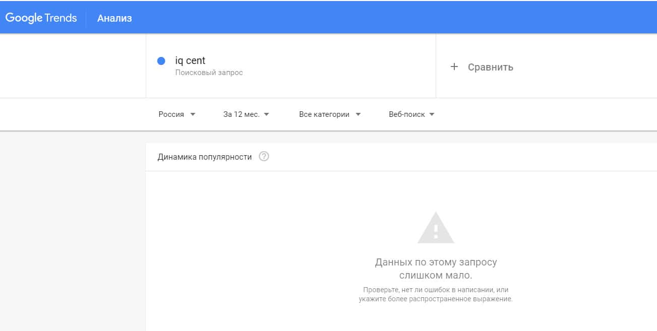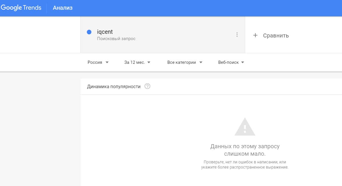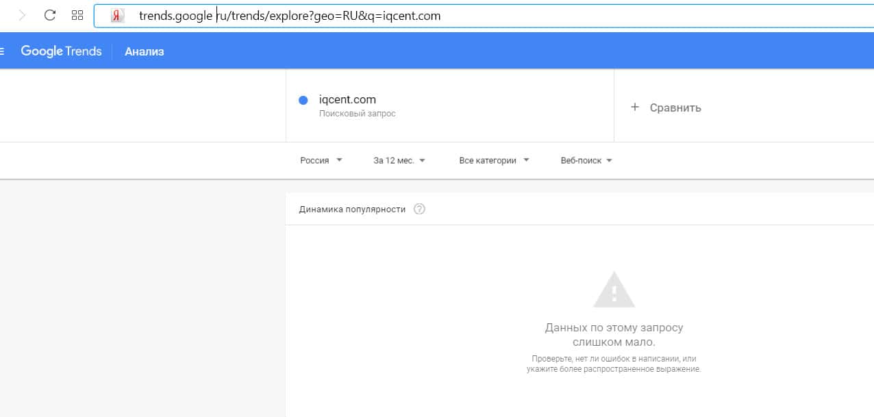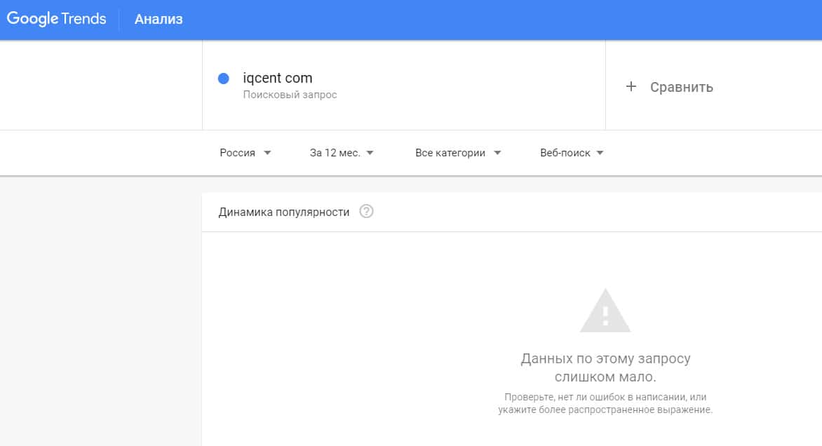 Количество запросов от пользователей по доменному имени "iqcent com" в сервисе Гугл Тренд было очень небольшим.