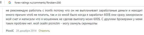 Очередной пострадавший не рекомендует работать с конторой Айрон ФХ, так как жулье не выплачивает заработанные деньги и находит много причин, чтобы не платить. В его случае аферисты не желают выплачивать ему 600 долларов и они заморозили его счет, обвинив его в мошеннических действиях.