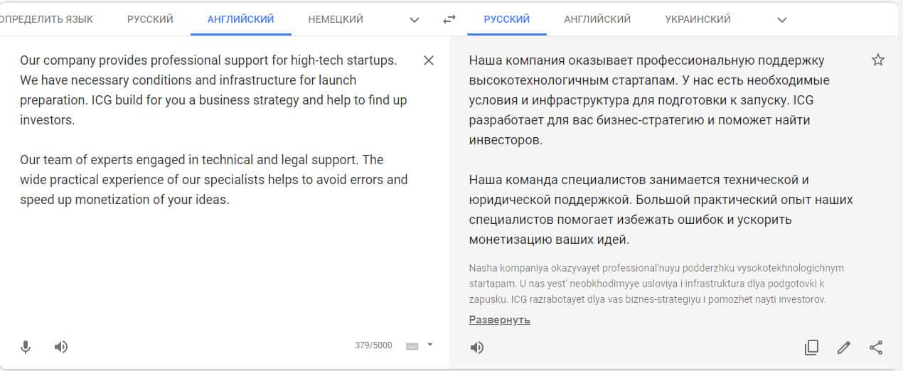 Перевод того, что жулики говорят сами о себе на сайте на translate.google com.
