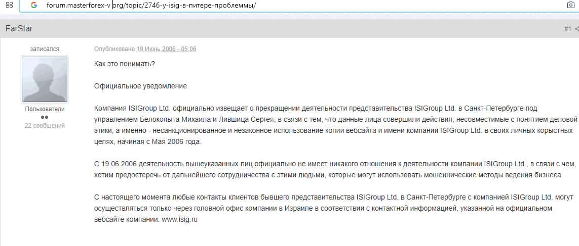 В данном посте на одном из форумов, один из пользователей рассказал, что контора ИСИГ прикрыла свою деятельность в Санкт-Петербурге из-за того, что руководство в лице Белокопыта Михаила и Лившица Сергея совершили мошеннические действия по отношению к своим клиентам и компании в корыстных целях.