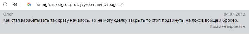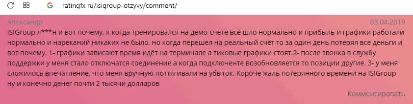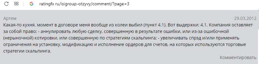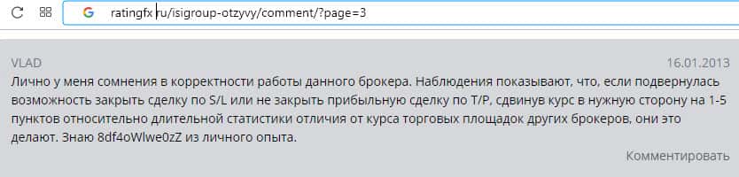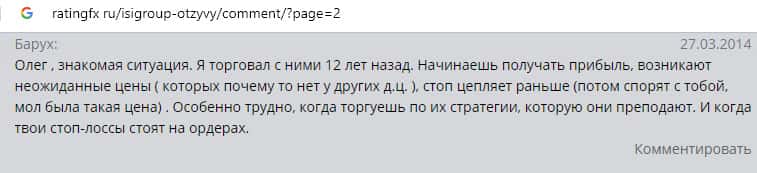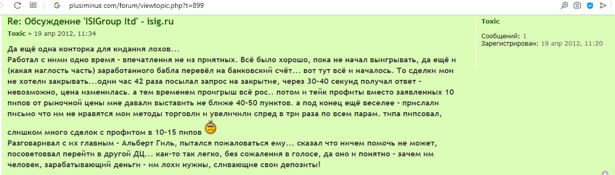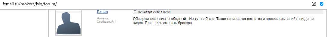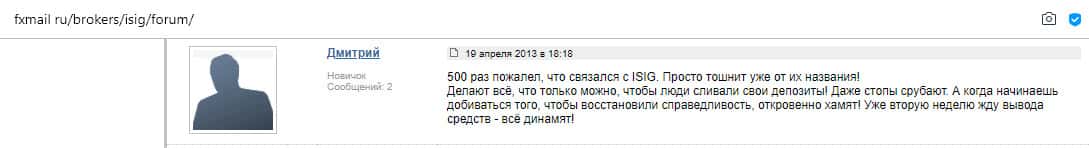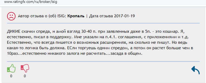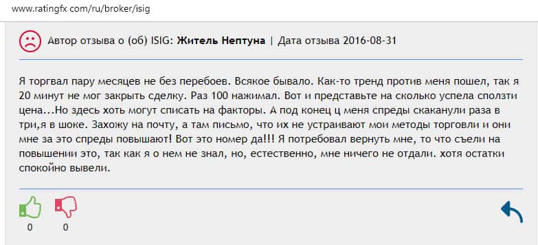 По мнению еще одного пользователя сети, брокерская кухня ISIG грабит своих клиентов, при чем делают это все искусно. Они используют расширение спредов и из-за этого практически ни один депозит не сможет выдержать такой нагрузки. Какой бы опытный был трейдер - он все равно сольется.