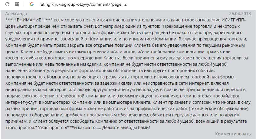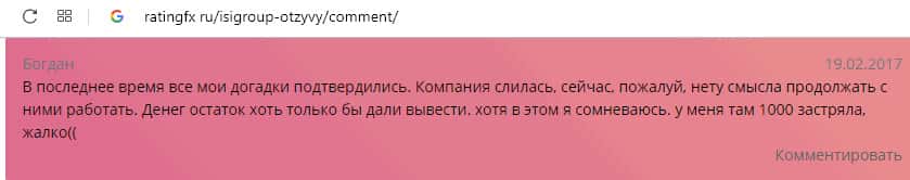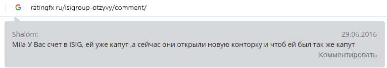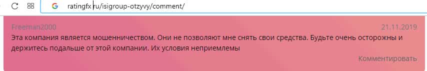 Еще один человек просто в шоке от происходящего, так как мошенники ISIG врут и не краснеют касательно своей гнусной деятельности. Дело в том, что негатива в интернете очень много и скорее всего это написали реальные люди. Если сравнить шаблонность текста позитивных комментариев, то результат на лицо.