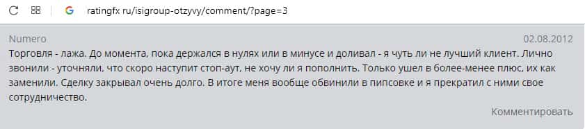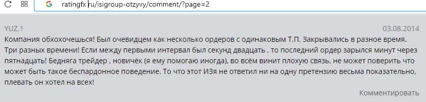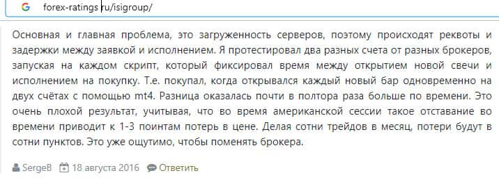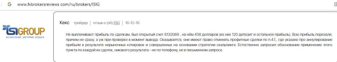 В следующем отзыве трейдер рассказал, как он однажды попал в шарагу ISIG и лишился там всех своих вложений. Брокер ведет себя подозрительно, особенно это отображается в процессе торговли. Когда человек заработал определенную сумму, то начались проблемы с исполнением ордеров из-за неправильных котировок.