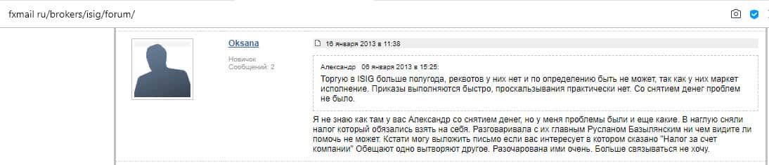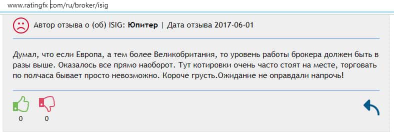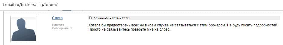 По мнению еще одного пользователя сети, брокерская контора ISIG занимается обыкновенными махинациями с ценами. При чем делается это довольно открыто и все можно проверить самому. Когда начинаешь предъявлять претензии в техническую поддержку, то там моментально бросают трубку.