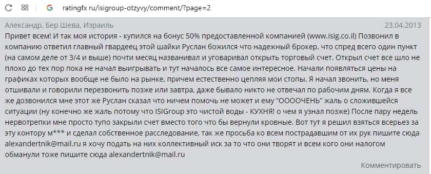 Если обманщики обворовали Вас, то тогда не допустите, чтобы жулики ISIG продолжали дальше сливать таких же малоопытных трейдеров как Вы в будущем, не забывайте делиться своим горьким опытом.