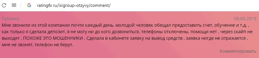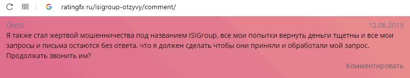 - Отзыв от жертвы мошенничества со стороны аферистов ИСИГ