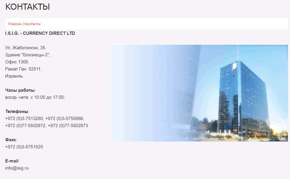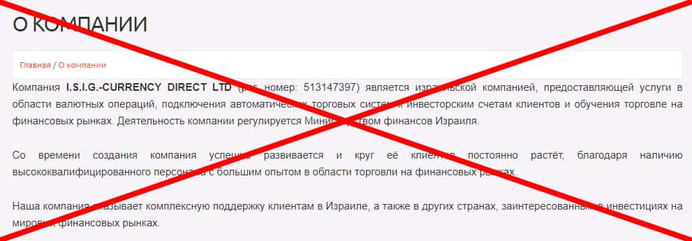 ISIG - израильская мошенническая контора, которая предоставляет фейковые услуги в области валютных операциях Форекс, торговых роботов и инвесторским счетам наивных клиентов, а также липовое обучение в этой сфере. Если вы не хотите стать их спонсорами, то настоятельно не рекомендуем даже разговаривать с ними!