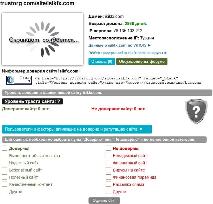Но жулики Исик ФХ активно работают не только по отзывам, но и удаляют оценки с известных порталов, где каждый желающий может поставить свою оценку работе любой компании. Так вот на сайте "Доверие в Сети" нет ни одной оценки о работе этого лохотрона. Это сразу же должно насторожить вас. Но, увы, далеко не всех настораживает...