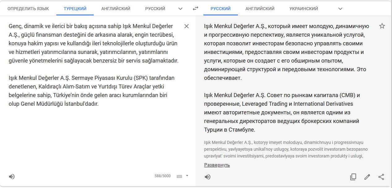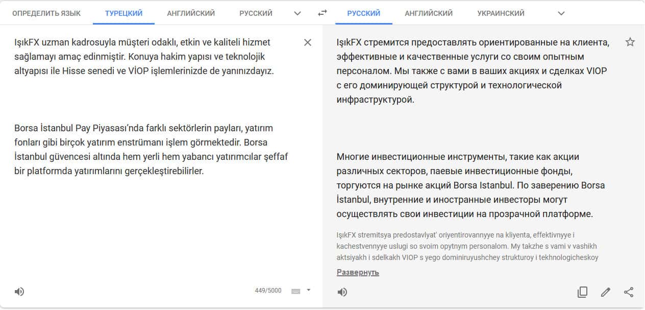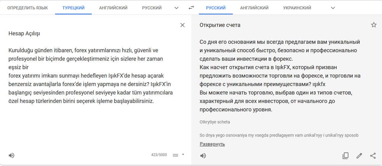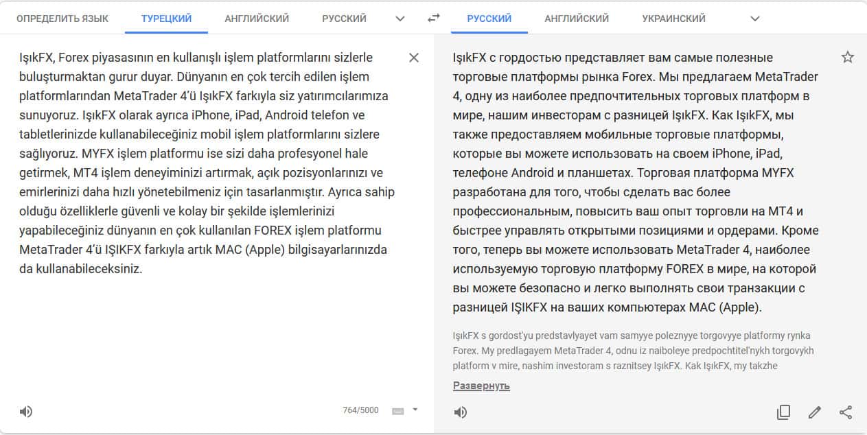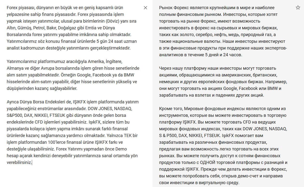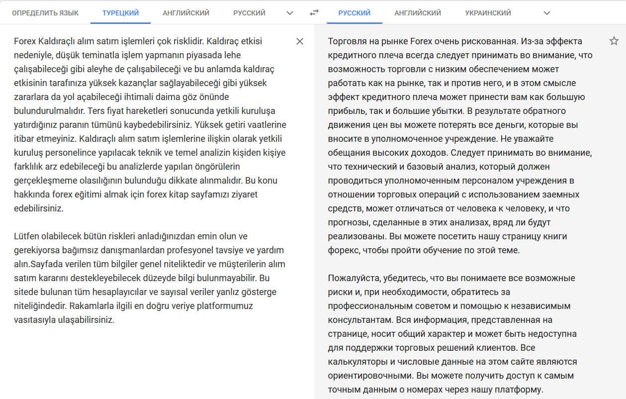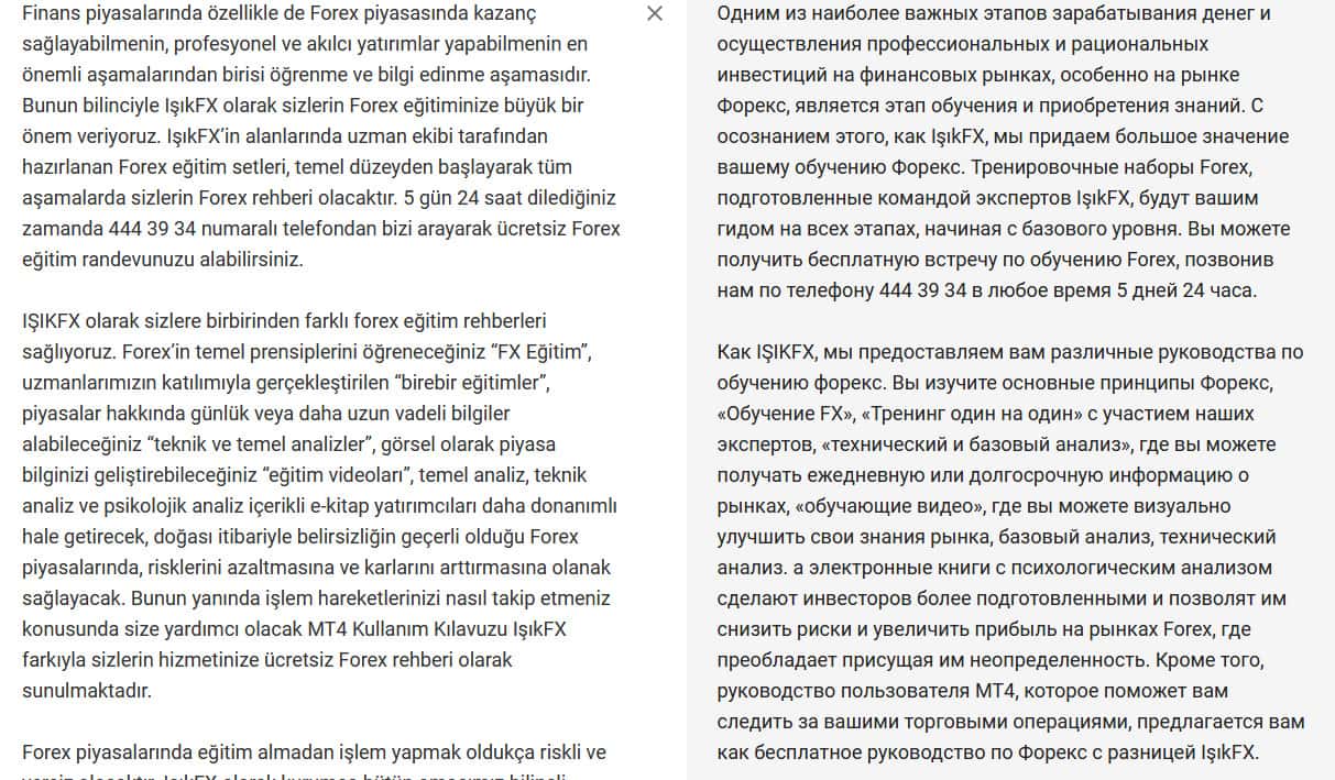 Перевод описания уведомления о рисках мошенников IsıkFX на сайте translate.google com.