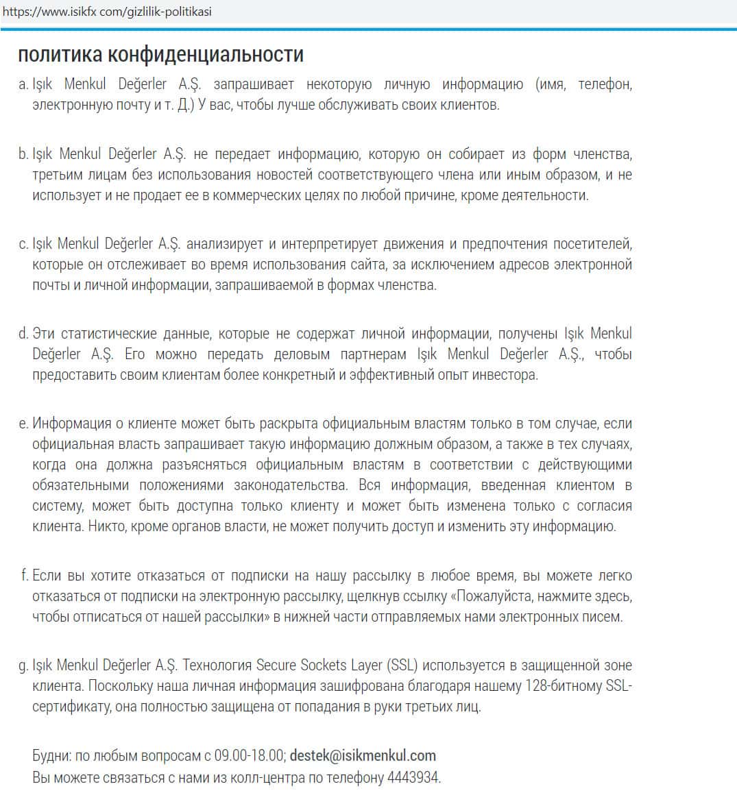 Политика конфиденциальности Исик ФХ не дает вам как клиенту гарантии сохранности ваших персональных данных. После скама, жулики с легкостью передадут ваши данные в руки третьим лицам или просто откроют еще один лохотрон и опять начнут вам наяривать. Вам это нужно? Наверное нет, поэтому держитесь подальше от них.