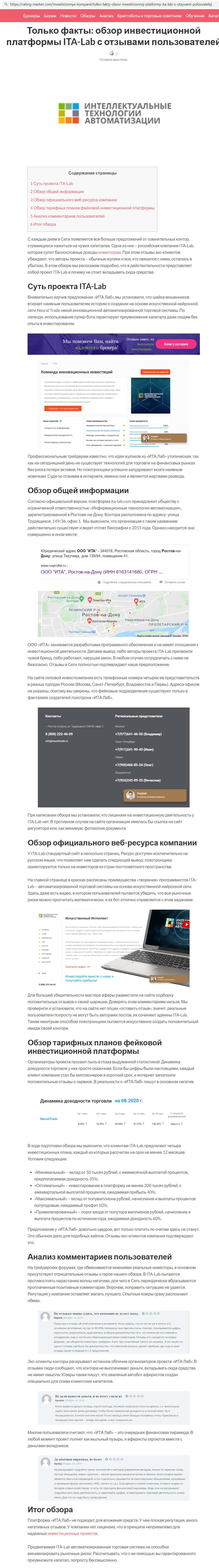 Далее мы нашли сайт otziv-broker com, на котором наткнулись на огромную статью о ИТА Лаб, в которой сайт разоблачил фирму и указал, что это просто обыкновенные шарлатаны.