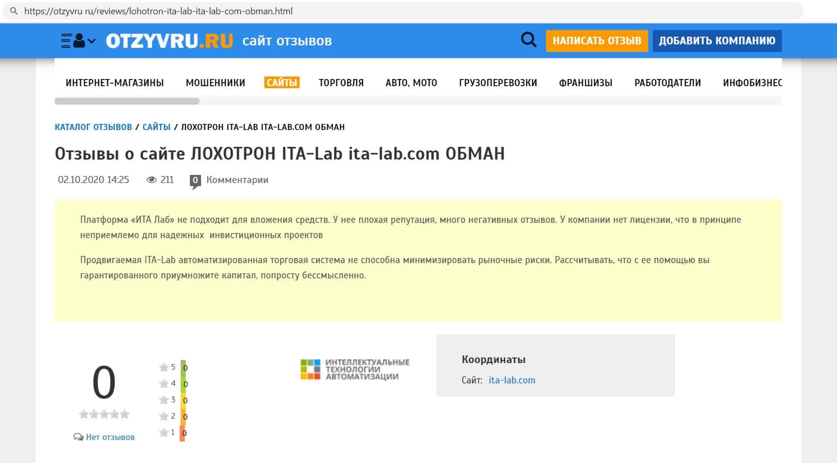 otzyvru ru - информация о проекте жуликов ITA Lab