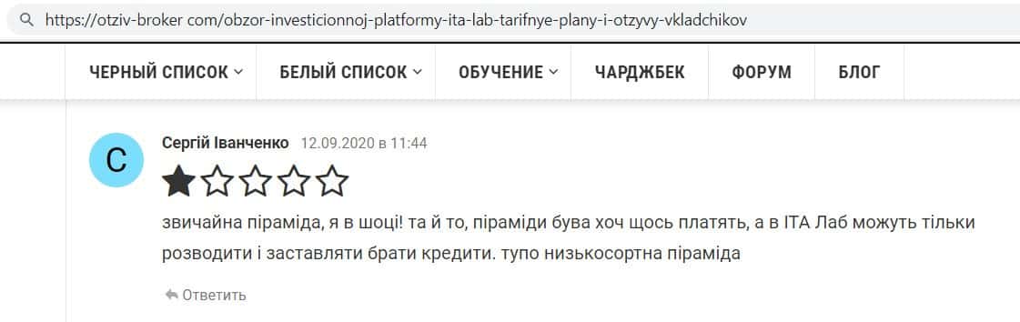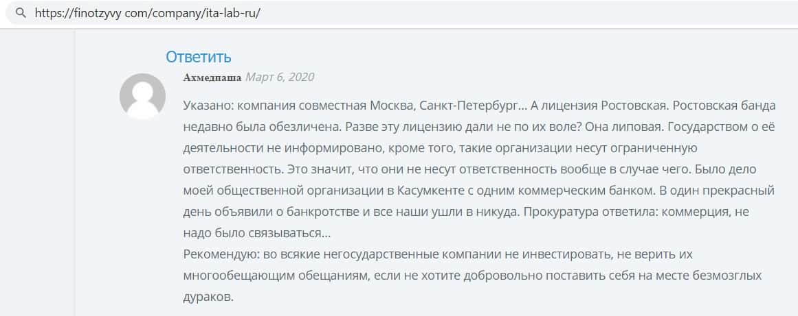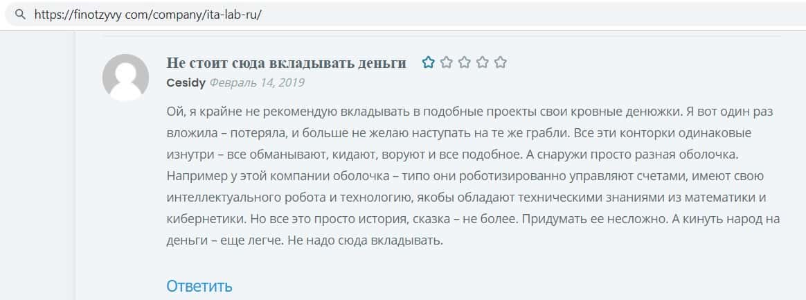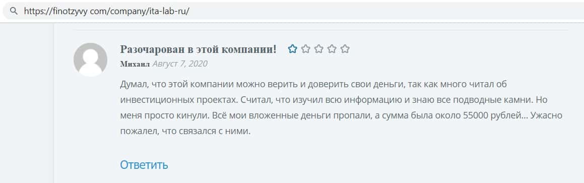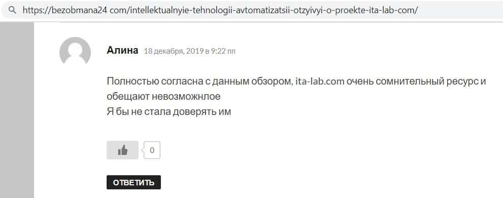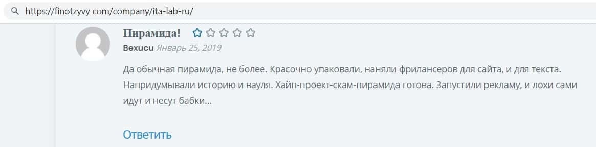 Ещё интернет ресурс otzyvru ru выразил своё мнение по поводу махинаторов ITA Lab. Сайт указал, что данный проект не подходит для финансовых вложений, так как это мошенники.