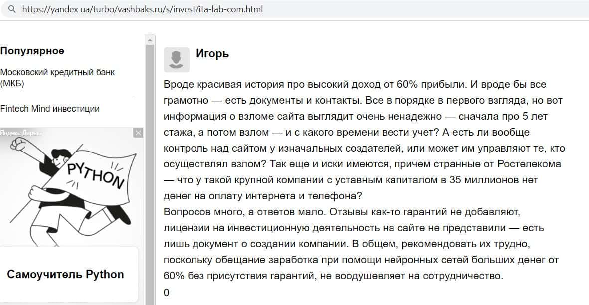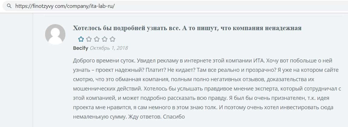 Ещё один пользователь заинтересовался фирмой ITA Lab, но после того как почитал о ней отзывы он очень удивился, узнав о том, что данная организация разводит своих клиентов.
