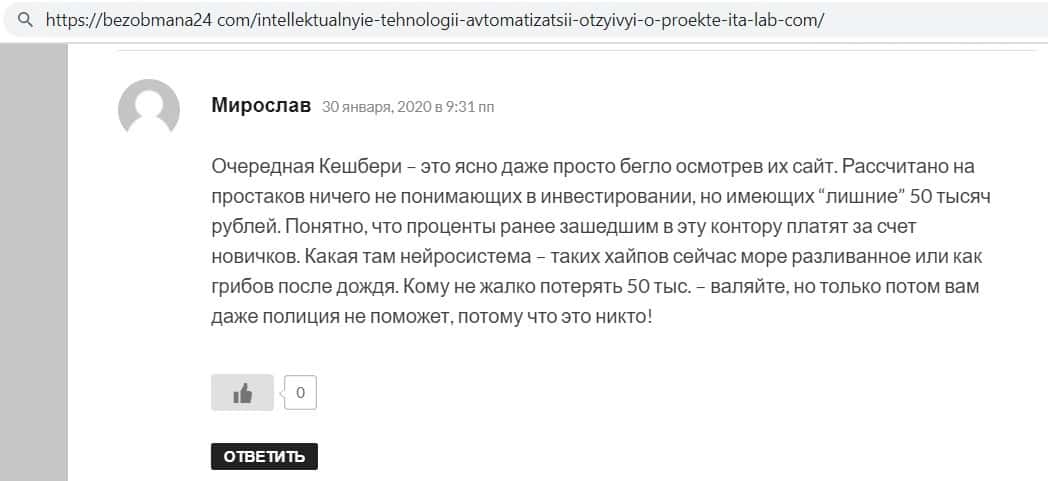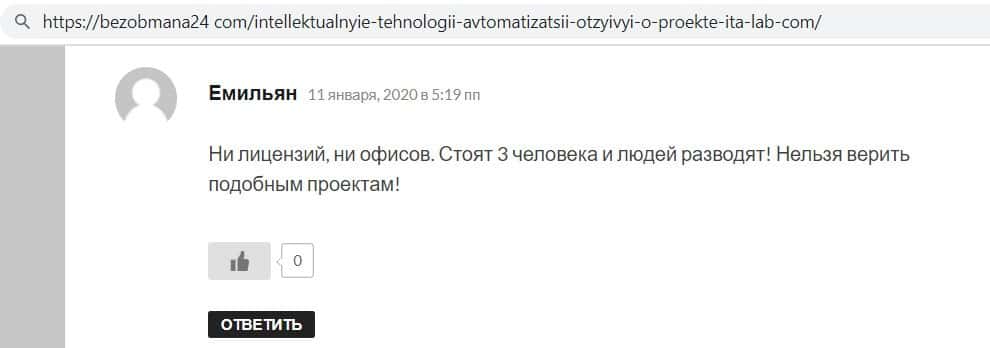 - Отзывы интернет - пользователей о мошенническом проекте ИТА Лаб