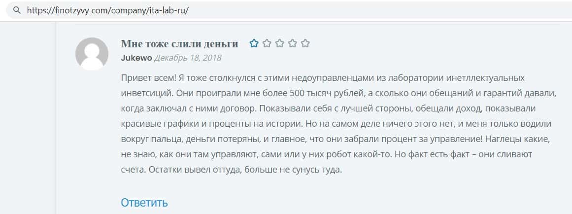 В этом отзыве о фирме махинаторов ITA Lab пользователь сообщил, что сотрудничал с данной компанией, и несмотря на все гарантии, компания кинула его на пол миллиона рублей.