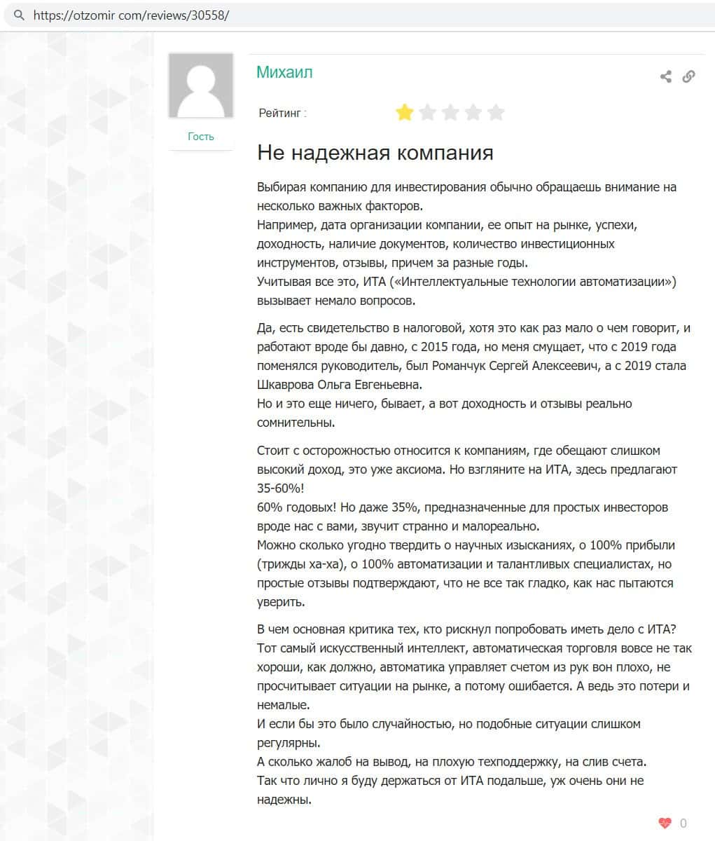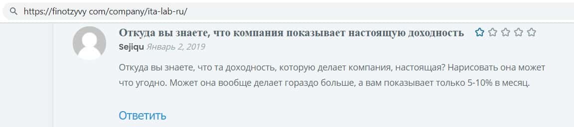 В своём отзыве данный пользователь сообщил, что фирма ИТА Лаб не внушает доверия, по этому вкладывать в неё деньги нежелательно, потому, что у фирмы очень плохая репутация.