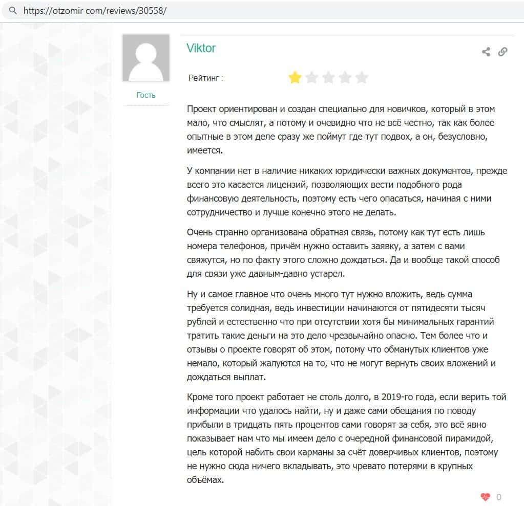 В данном отзыве пользователь сообщил, что это очередные мошенники, которые нацелены на пользователей, которые ничего не понимают в финансировании, но имеют деньги.