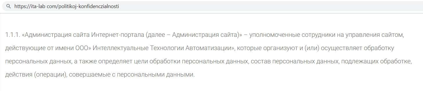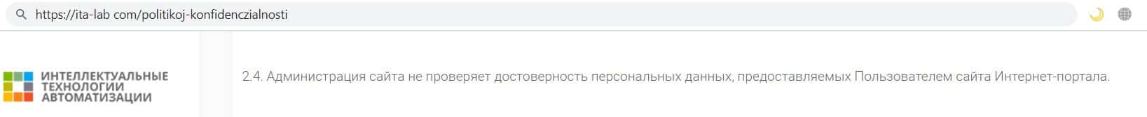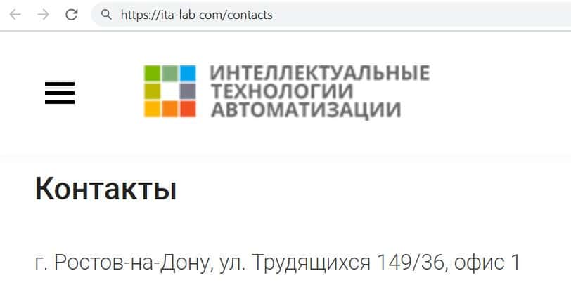 На своём главном сайте компания мошенников ITA Lab представила своё юридическое лицо, которым является фирма ООО "Интеллектуальные Технологии Автоматизации".