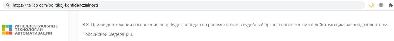 Так же контора кидал ИТА Лаб указала, что в случае недостижения согласия в споре с клиентом, компания вправе обратится в суд, но вот только фирма является нелегальной.
