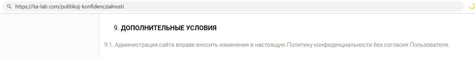 Так же компания махинаторов ITA Lab указала, что вправе в любое время изменять пункты соглашения и других документов без предварительного предупреждения своих клиентов.