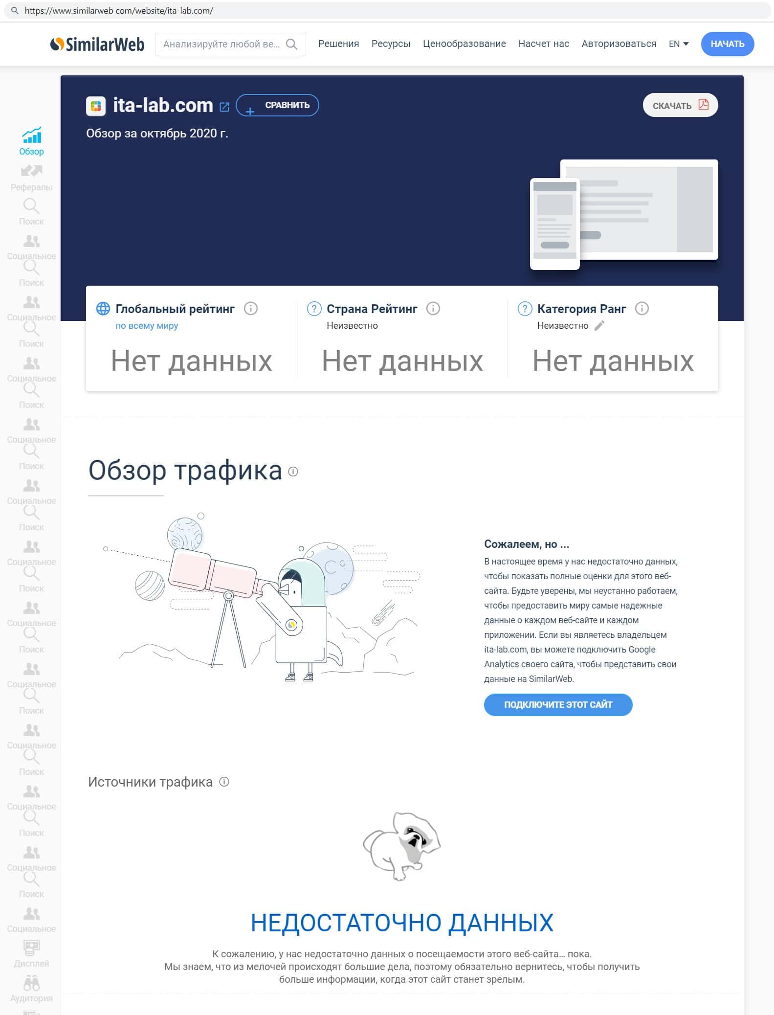 Что бы узнать информацию о трафике сайта кидал ИТА Лаб, мы использовали сайт similarweb com. Выяснилось, что международный сервис не знает о существовании этой фирмы.