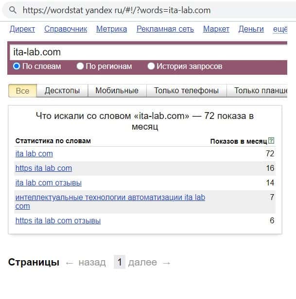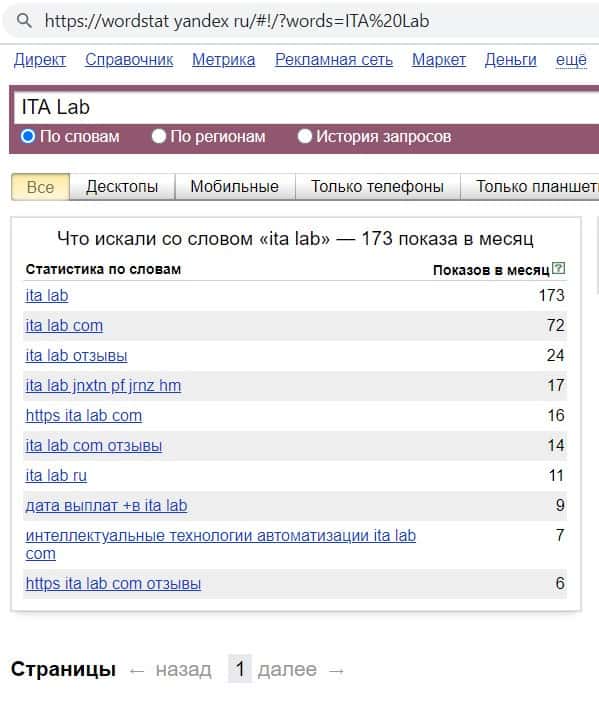 - Количество запросов компании махинаторов ITA Lab в Яндексе