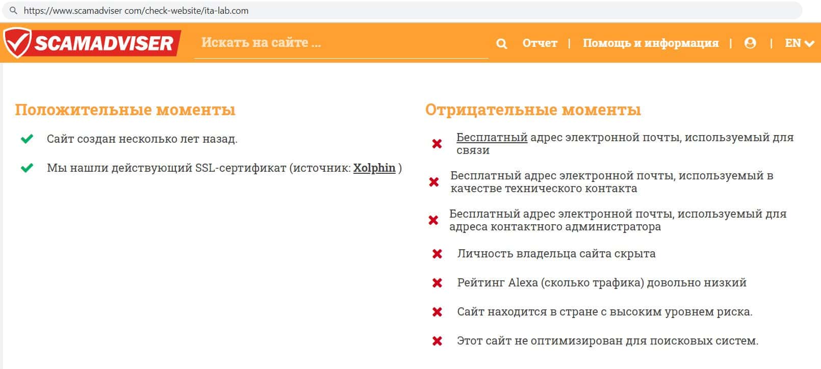 Мы проверили сайт ITA Lab через сайт scamadviser com. Оказалось, что сайт аферистов имеет низкий рейтинг, не оптимизирован для поисковиков и скрывает личность владельца.