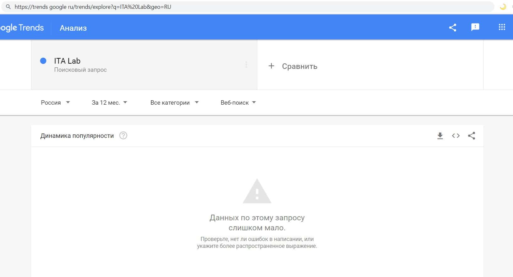 Проверить мы решили количество запросов фирмы ITA Lab в Google по названию компании, а именно "ITA Lab". Но оказалось, что данный запрос никто не выполнял целый год.