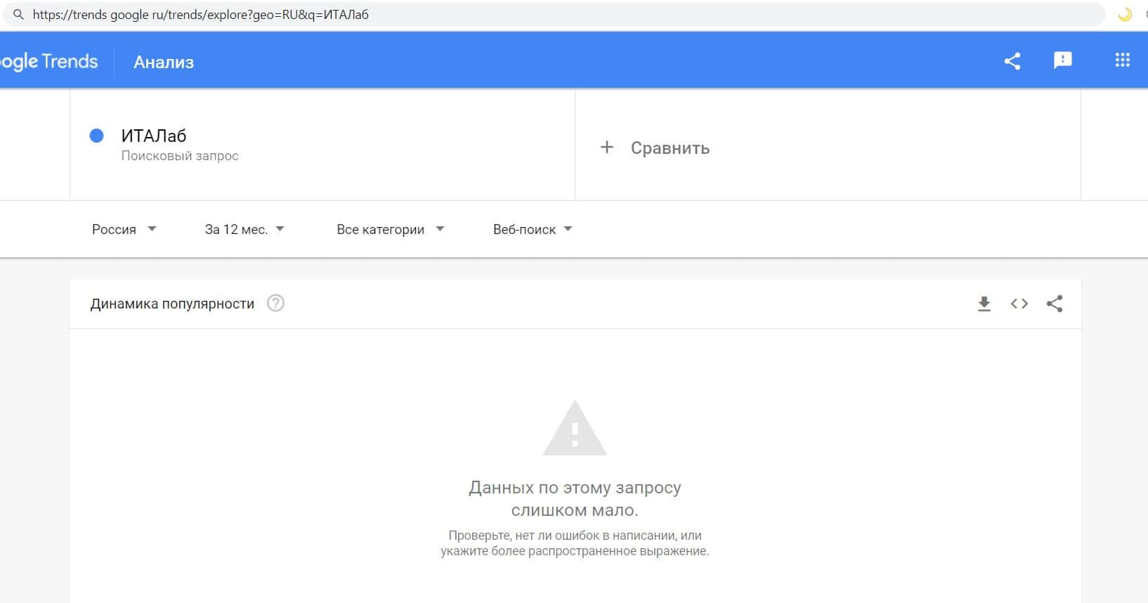 Так же мы проверили количество запросов лохотрона ИТА Лаб по русскоязычному названию, но без пробела, а именно "ИТАЛаб". Но и этот запрос никто не выполнял целый год.