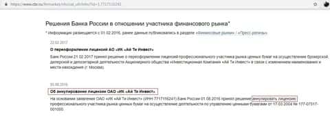 С лицензией у шулеров ITI Capital все выходит немножко странно. Странность заключается в том, что жуликами ИТИ Капитал, а точнее акционерному обществу Ай Ти Инвест, когда то выдали лицензию. Однако в 05.05.2016 Банк России принял решение аннулировать лицензию профессионального участника рынка ценных бумаг на осуществление деятельности по управлению ценными бумагами, тем самым лишив аферистов ITI Capital разрешения на осуществление подобной деятельности. К тому же, сам сайт мошенников ИТИ Капитал был создан намного позже аннуляции лицензии, что наводит на мысль о том, что представители жуликов ITI Capital подались во все тяжкие ради денег.