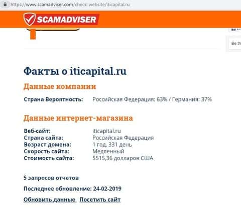 С помощью именно ресурса scamadviser com можно узнать, что аферистам ITI Capital отроду менее года. Данный факт является подтверждением вышесказанного о том, что мошенники ИТИ Капитал либо пытаются срубить денег после закрытия конторы, либо кто-то на основе информации об бывшей организации быстренько создал сайт и разводит наивных клиентов на бабки.