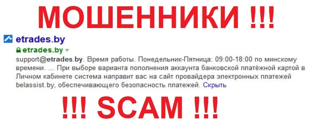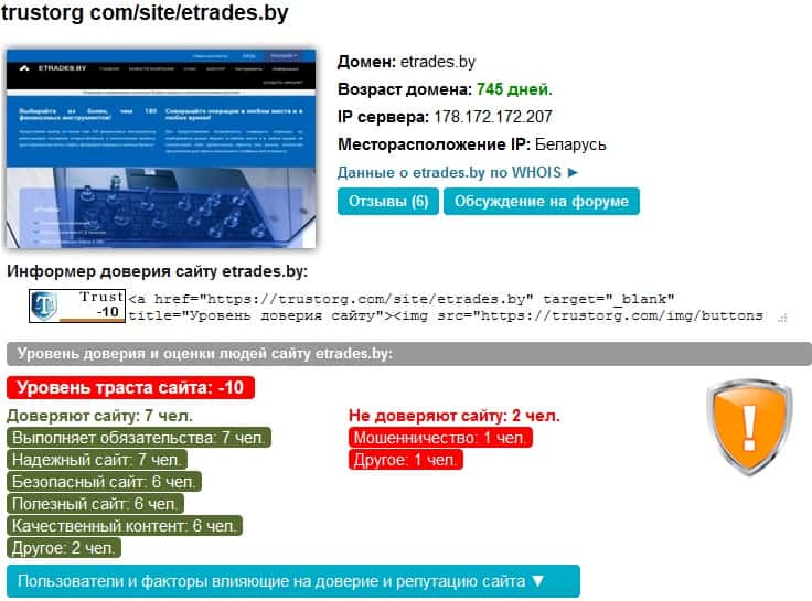 Есть такой известный оценочный портал в сети, как "Доверие в Сети". На нем каждый пользователь может поставить свою оценку работе того или иного проекта. Так вот на нем пользователи однозначно дают понять, что ETrades - это мошенничество. И даже накрученные боты не помогают в общей оценке.
