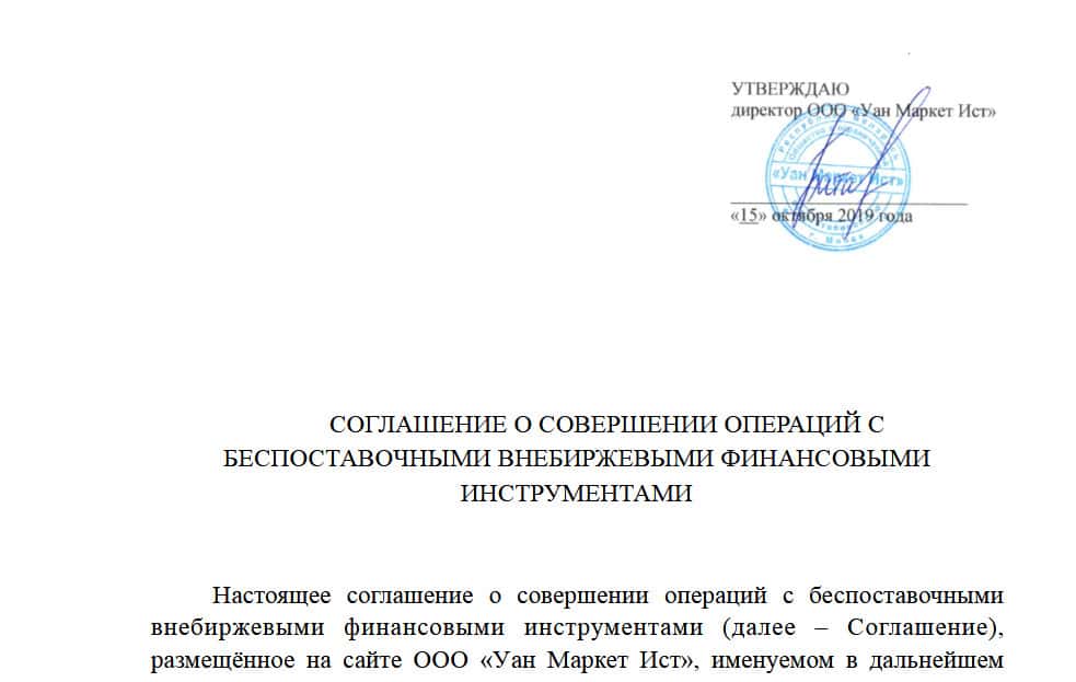Здесь жулики ИТрейдс не скупятся на пафос и предоставляют клиентам аж целых 3 договора на заключение. И первый - это на Совершение операций с беспоставочными внебиржевыми финансовыми инструментами". Разумеется, что это все для отвода глаз, этот договор никто исполнять не собирается.
