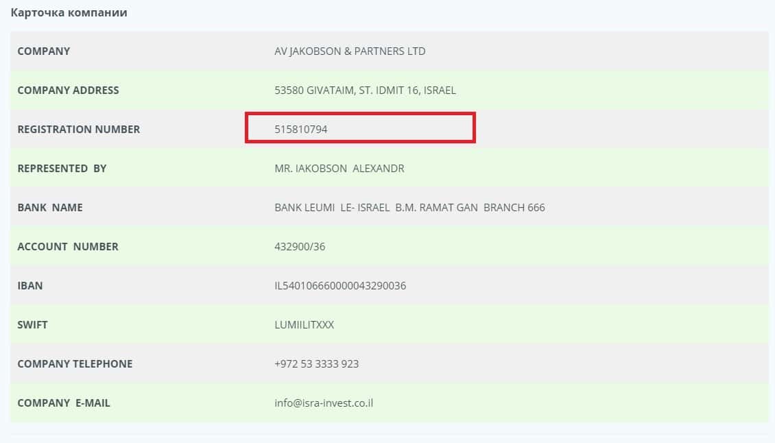 Чтобы себя обезопасить, мошенники Изра Инвест решили зарегистрироваться подальше от стран СНГ. И судя по информации на сайте, они находятся в Израиле.