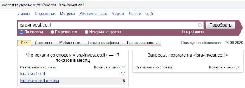 Переходим к запросам на русском языке. Первый запрос в Яндекс на русском языке "Изра Инвест" выдает результат в 0 показов в месяц. Так информацию о жуликах не ищут в сети.