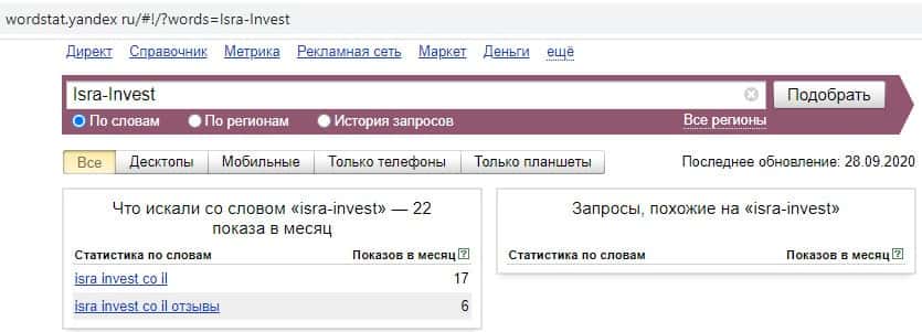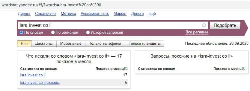 И последний запрос в яндексе на русском языке "ИзраИнвест" без пробела выдает результат в 0 показов в месяц, как и в предыдущем случае.