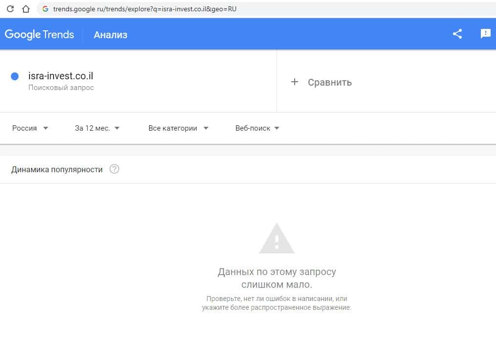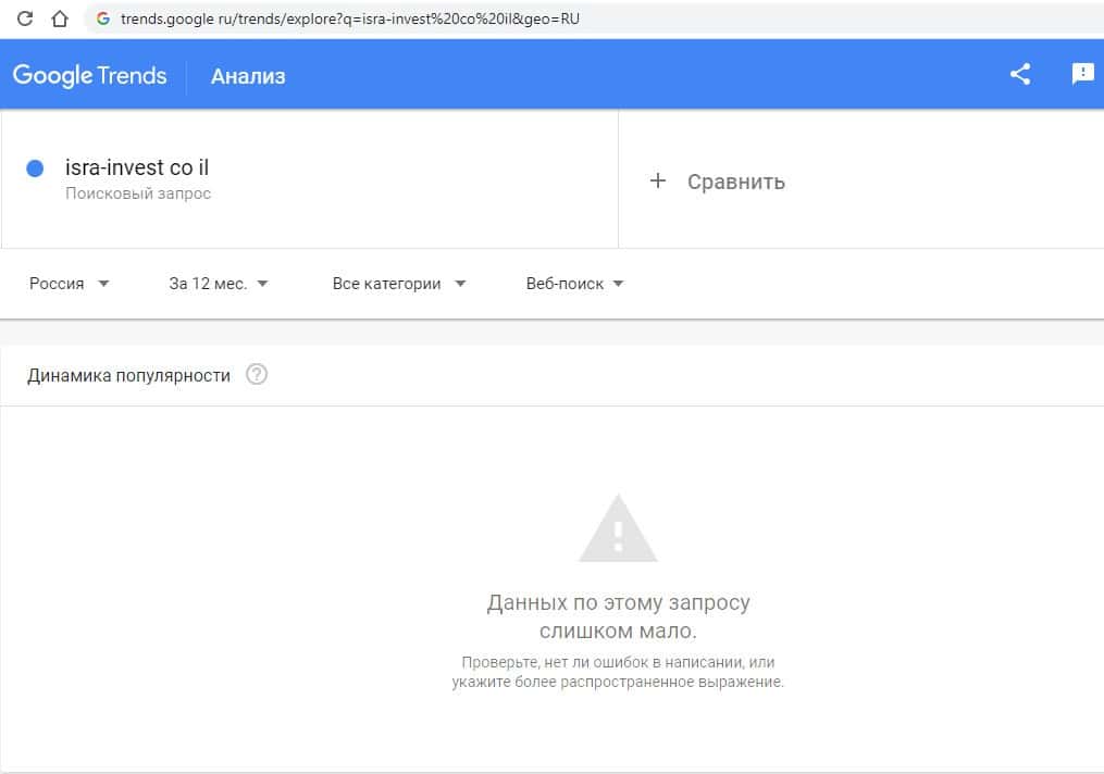 Начинаем с запросов на английском языке. Первый запрос на английском в Гугл "isra-invest co il" выдает результат в 0 показов в месяц. По такому запросу инфо о жуликах не ищут.