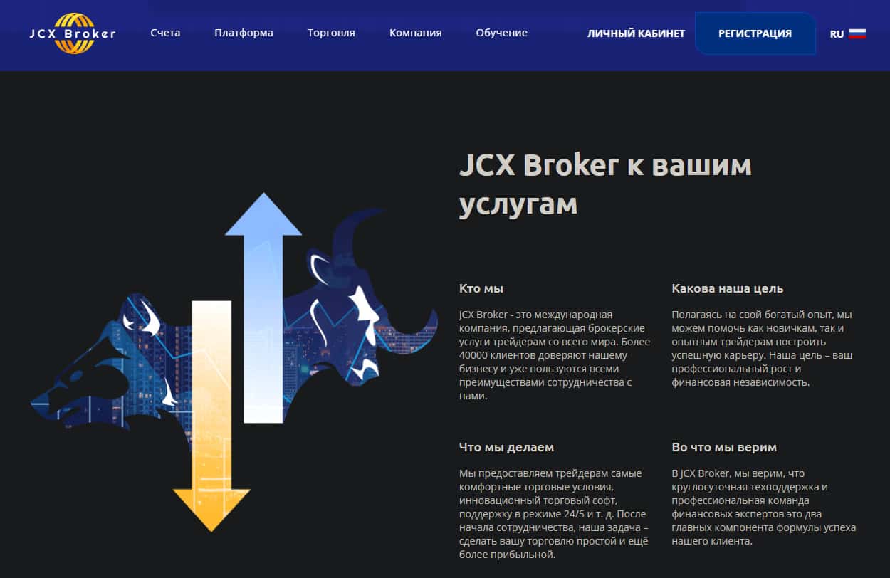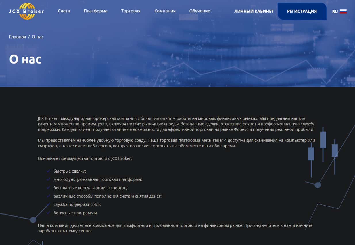 Начинается подвальный сайт у жулья ДжейСиИкс Брокер довольно типично и ожидаемо, а именно со стандартной шапки сайта, в которой у аферистов JCX Broker имеется стандартная лапша на уши наивной клиентуре, под предлогом которой мошенники ДжейСиИкс Брокер будут кидать клиентуру на деньги, а так же ссылки на разделы сайта аферистов.