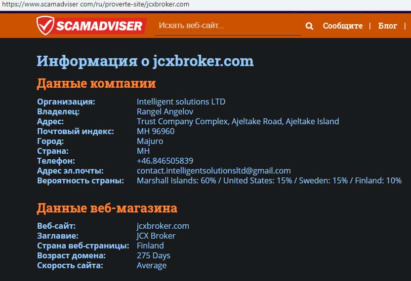 В связи с мошеннической и противозаконной деятельностью лохотрона JCX Broker его реальные руководители предпочитают анонимность дабы избежать ответственности со стороны правоохранительных органов. Техническую же информацию о сайте жулья ДжейСиИкс Брокер можно узнать с помощью портала scamadviser com, что вы можете увидеть ниже.